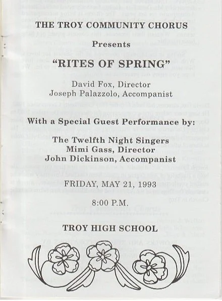The Troy Community Chorus was founded in November 1978. It started as a community education class and was called “Troy All City Choir”. Daniel Boyce was director and Elissa Hepner pianist. The first concert was at Troy Athens High School on December 11, 1978, performing Handel’s Messiah.